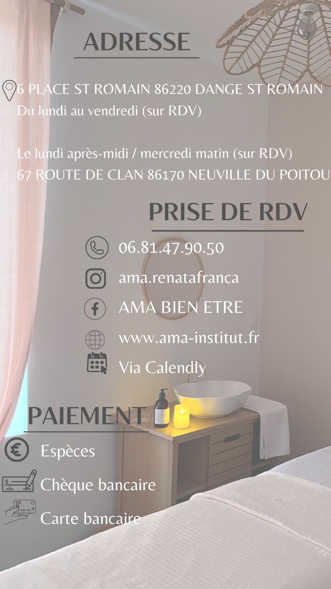 J ai connu la méthode Renata, par les réseaux sociaux d' Anne. Elle m'a tout bien expliqué au début . J'ai bénéficié d'un drainage lymphatique corps et un soin miracle face. Je ressens depuis , une amélioration sur mon endormissement et mon sommeil. Quelques jours après j'ai eu comme des nausées mais mes ballonnements ont diminués , et je me sens plus légère qu'avant. Je recommande sans hésitation Anne ! A noter : elle vient également sur Neuville de Poitou ;)